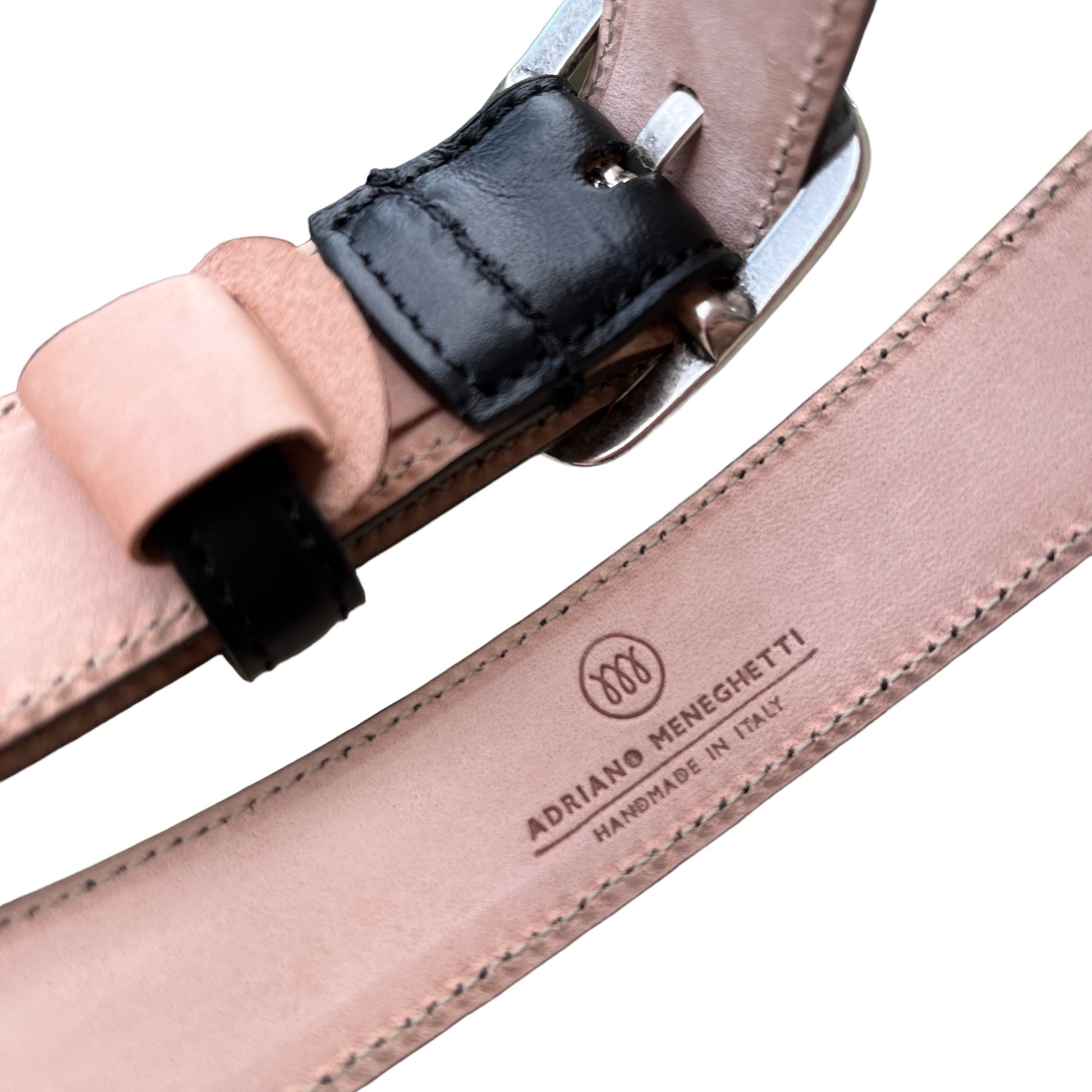 The Adriano Meneghetti (Gadir) belt is crafted from luxurious calf leather, offering a stylish staple for any wardrobe. It comes in brown with gold hardware and black with silver hardware for versatile styling. Enjoy quality craftsmanship and a luxurious look with an Adriano Meneghetti belt.